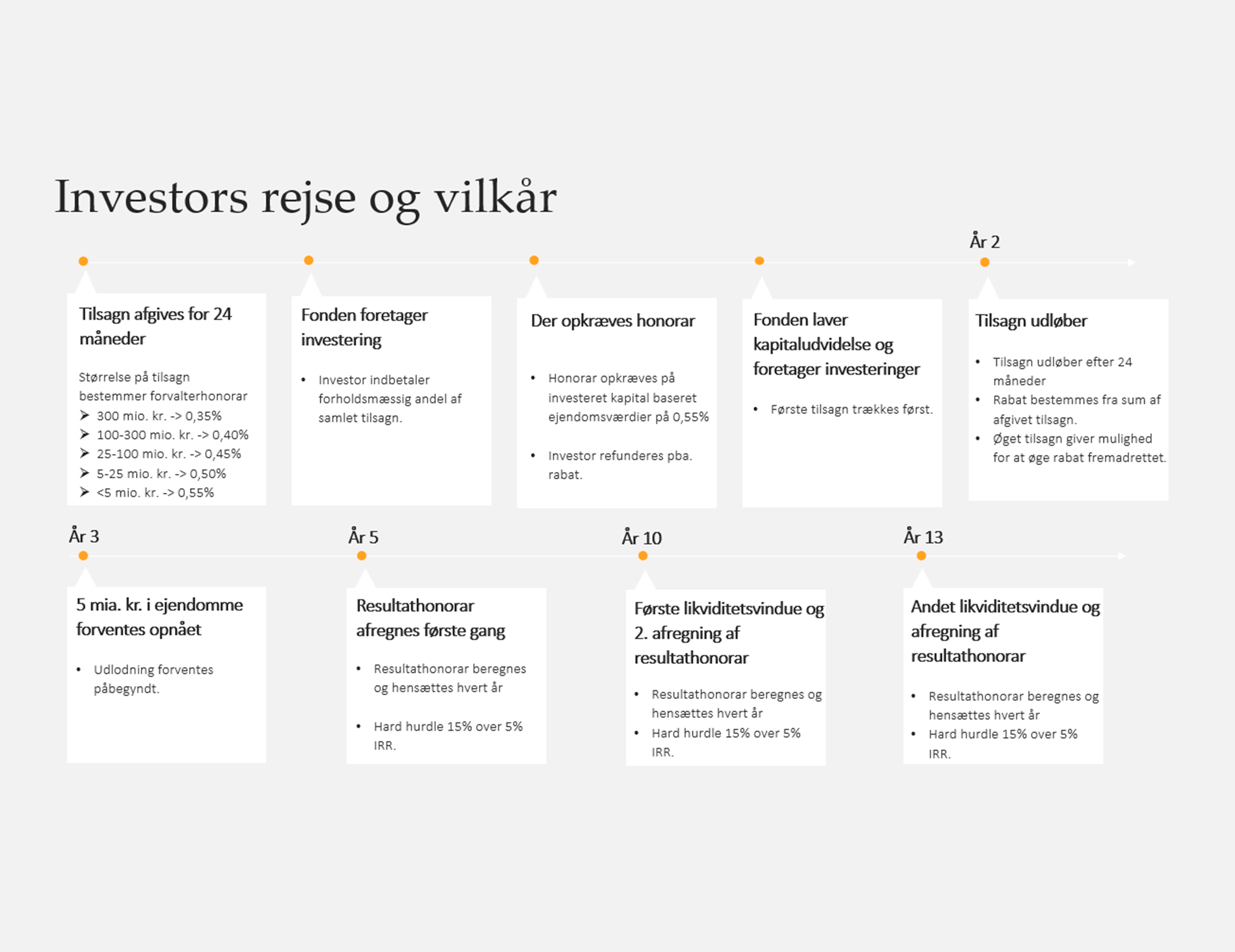 På oversigten til højre kan du se investors rejse og vilkår illustreret – den detaljerede gennemgang findes i Offering Memorandum